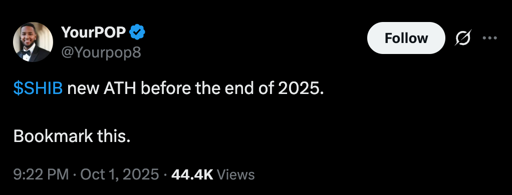 Add in the usual Q4 bullish tide for altcoins, and SHIB seems to be all set for another market shocker move. Market commentator YourPOP has even called for a new ATH before the end of 2025.