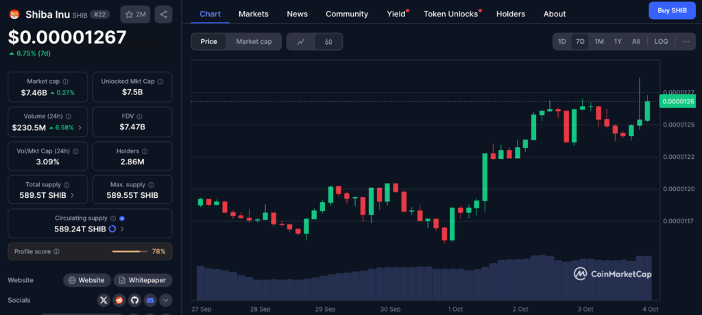 Shiba Inu has a knack for stealing the spotlight when altseasons return. And this cycle looks no different. Trading at $0.00001267 as of October 4, 2025, SHIB has already staged a 6% price pump in the past week. This quick climb in early Q4 only goes on to show that bulls are waking up for the altseason.