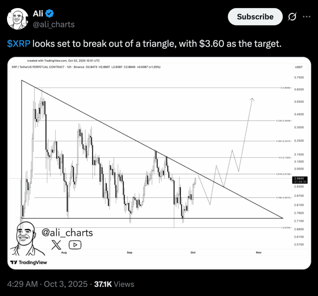 Analysts are equally bullish. Ali Martinez says XRP can break out of its triangle pattern with $3.60 as the target. That’s an 18% price pop from here. And that’s exactly why XRP remains one of the altcoins to watch.