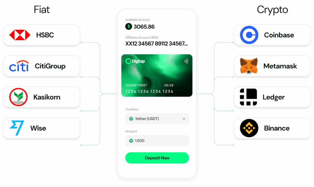 As the world’s very first omni-bank, Digitap has brought fiat and crypto into one borderless money app. It also offers virtual and physical cards, instant global transfers, offshore accounts, and even automated FX routing. All of this is served inside a single dashboard.