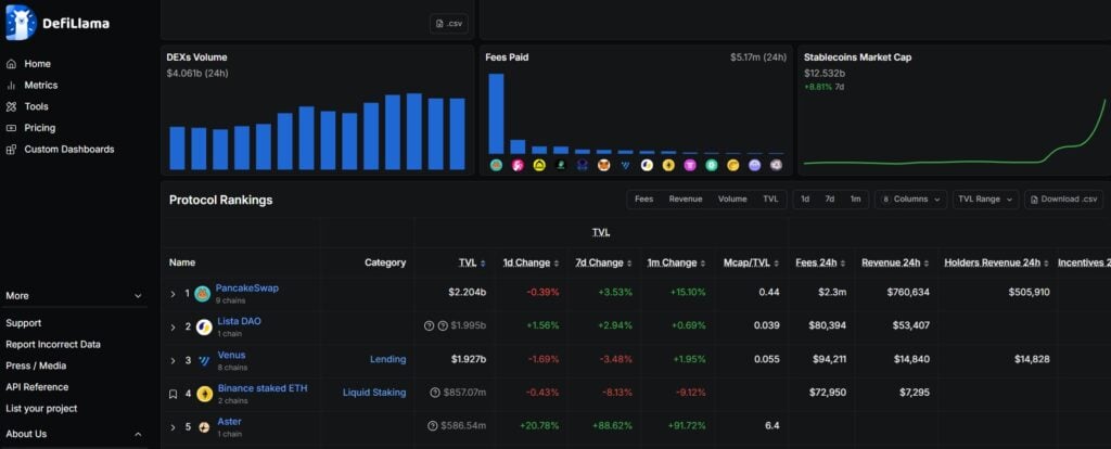 On DeFiLlama, Aster is climbing the BNB Chain TVL rankings and is now competing with PancakeSwap in trading volume, in some cases even surpassing it.