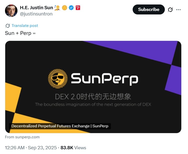 Justin Sun, the founder of TRON and one of the most recognized figures in the crypto industry (often compared to Binance’s CZ in influence), is teasing SunPerp as the next-generation decentralized perpetual exchange.