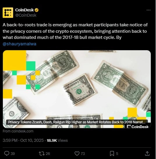 Privacy-focused cryptocurrencies are experiencing a renewed wave of interest as traders revisit the fundamental ideals that fueled the 2017–2018 bull market, according to CoinDesk. This resurgence marks a broader shift back toward privacy-centric projects that once dominated market discussions during earlier cycles.