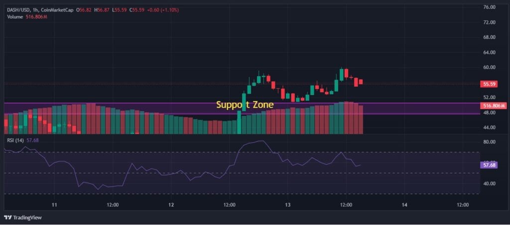 The asset managed to hold its ground impressively during recent downturns, maintaining support around the $30 mark when many other altcoins saw losses exceeding 70%. Currently, Dash trades around $55 and appears to be building a new support zone between $47 and $50.