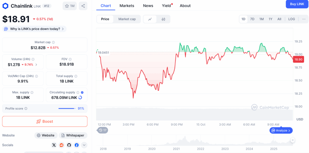 Chainlink (LINK) is trading at $19.08, down slightly by 0.16%, but its long-term trajectory remains bullish. The project’s decentralized oracle network is vital to DeFi and smart contracts, securely connecting real-world data with blockchain applications.