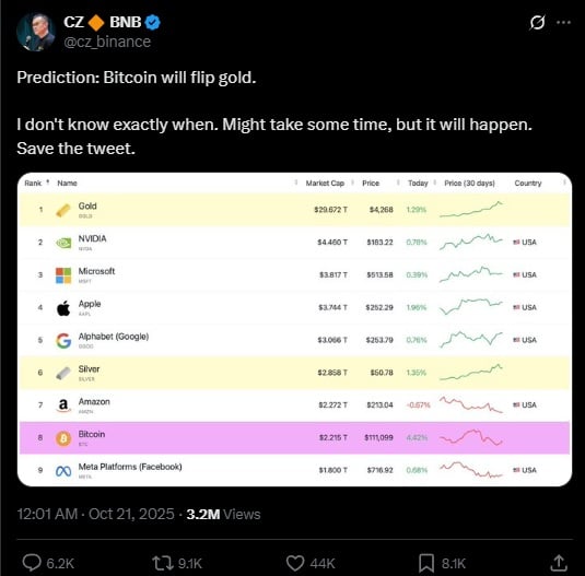 Meanwhile, Binance co-founder and former CEO Changpeng “CZ” Zhao reiterated his long-term optimism for Bitcoin, predicting it could eventually surpass gold in value.