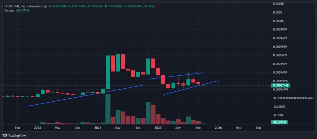 Floki recently surged nearly 27% in a single day, briefly reaching $0.0000883 before retracing. Despite this short-term spike, the token still trades well below its 2024 highs and faces strong resistance near $0.0001.