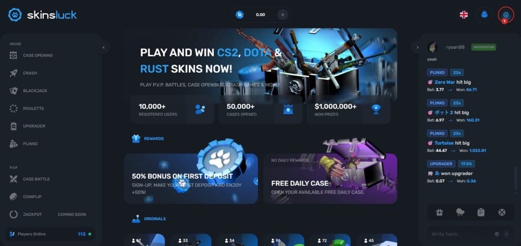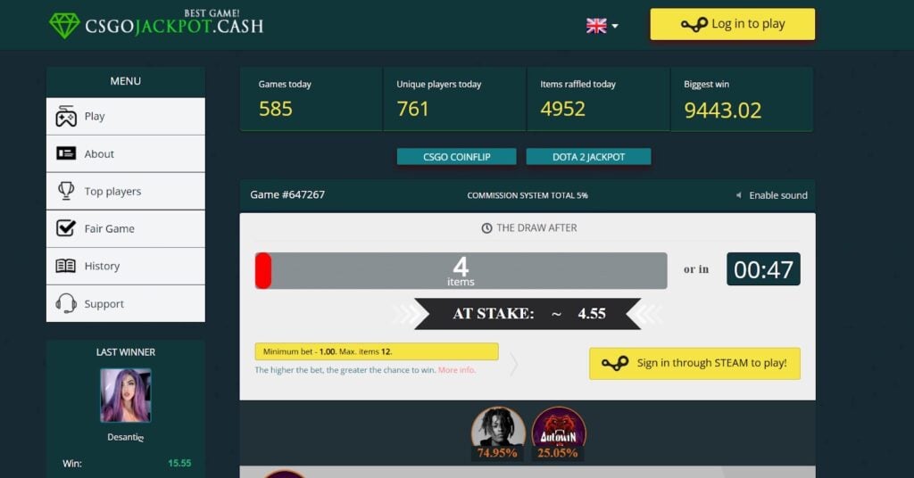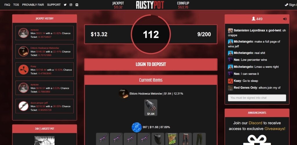 Rustypot started life as a Rust skin gambling site and still primarily caters to that community, but they’ve since added support for CSGO and TF2 skins through third-party integration. The platform only runs two modes – jackpot and coinflip -!keeping the scope intentionally narrow. If you’re looking for the best CSGO jackpot site with a retro vibe and minimal distractions, this scratches that itch.