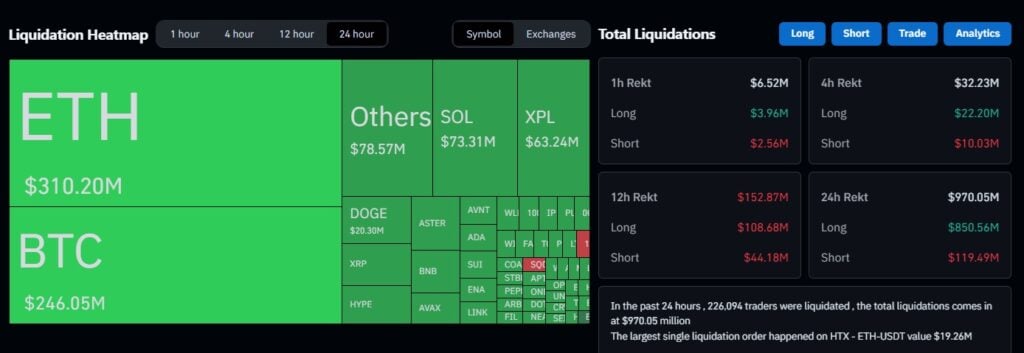 Market-wide liquidations have compounded the pressure, with billions of dollars in leveraged positions being wiped out in a short period. In fact, in the past 24 hours alone, total liquidations reached $971.15 million.