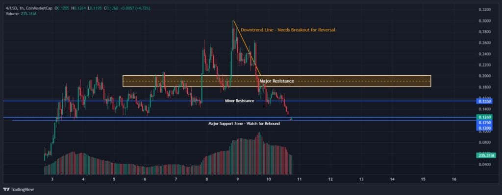 The token 4 is currently trading around $0.1238 after a steep decline from the $0.30 zone, showing a clear short-term bearish structure marked by consecutive lower highs and lower lows.