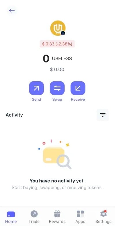 After registration, you will find yourself on the wallet’s Home page, but in order to buy Useless, you need to navigate to the second tab on the left, called Trade. In there, you will find several options, including Buy, Send, Swap, Receive, and History. Tap the Buy option, and you will see all the available coins and tokens. Navigate down the list until you find Useless Coin, and tap on its name.