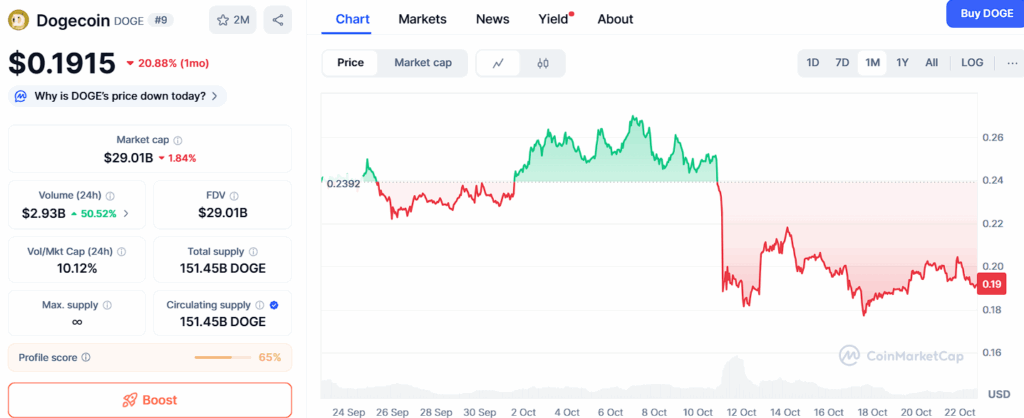 Dogecoin and Shiba Inu have once again captured interest as buyers look for high-upside performances in the early tiers of the bull run. DOGE presently trades around $0.1915, with support stages at $0.14, $0.11, and $0.09, and resistance ranges at $0.25, $0.33, and $0.45.