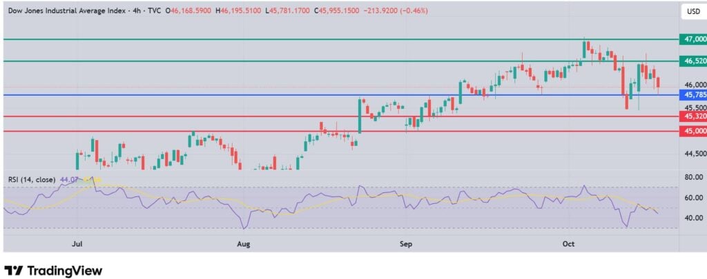 Today’s movement will depend on key technical levels. The zone between 45,785 and 46,000 points will be very important for traders. If selling picks up momentum, the first major support level for the Dow is around 45,320. If that support level isn’t held, the index could fall to the 45,000 psychological level.