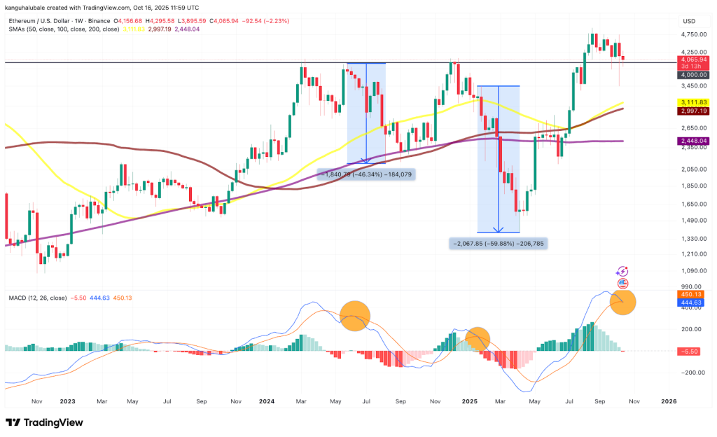 According to vigilant analysts, the weekly MACD on the Ethereum price chart has crossed bearish once more: a pattern that, in previous cycles, preceded an Ethereum price crash of 46% to 60%. With this warning blaring, rather than simply hoping for a rebound, this moment demands action. For savvy investors, this is the time to hedge, not hold blindly.