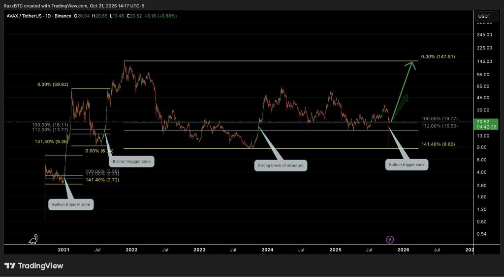 The AVAX chart shared by Razz shows a clear setup that Avalanche traders will recognize, the so-called bullrun trigger zone. Every big rally in Avalanche’s history started in a similar area of deep accumulation before a clean breakout.