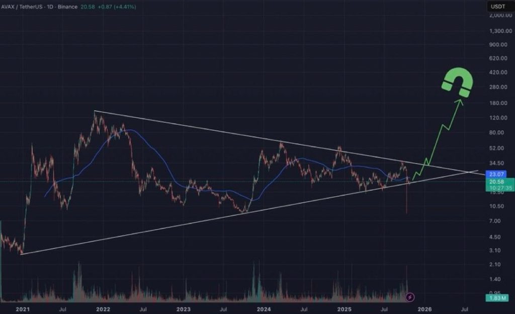 In a separate chart, Horse Beer highlighted a massive symmetrical triangle that’s been forming for nearly two years. Patterns like this usually end in a decisive breakout, and AVAX is approaching the point where the pressure has to release.