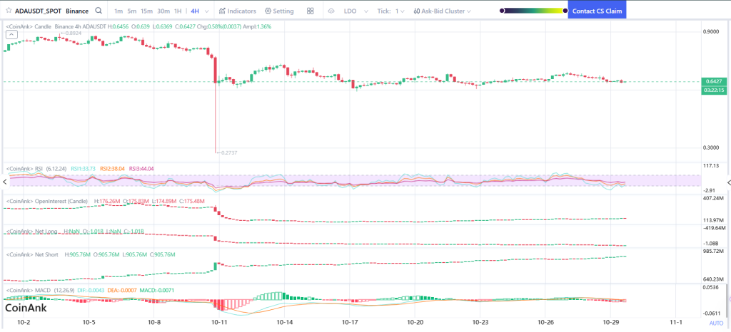 Cardano isn’t sprinting, but it’s holding its line. ADA price sits around $0.64 on the 4-hour chart from Coinank, after snapping back from that October liquidation wick that briefly pierced the low-$0.20s before buyers rescued the move.