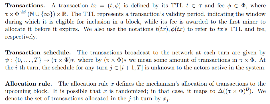 Mempool. The miner stores valid transactions that were not yet allocated to a block or expired in a data structure called the memory pool (mempool). Transactions which are not allocated to the upcoming block have to wait at least one more block until being mined, but some may become ineligible for inclusion as dependent on their TTL, which decreases by 1 with each passing turn. We define a mempool function that outputs the set of transactions viable for inclusion in each block.