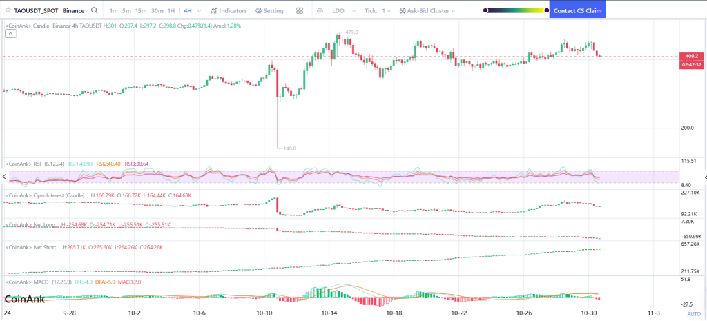 On the 4-hour chart, TAO price continues to print higher lows since mid-October. That means buyers still show up each time the price dips, keeping the uptrend alive.