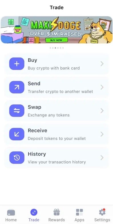 With your account created, you can proceed to the Trade tab, which is the second tab on the left at the bottom of your screen. There, you will find several options for managing your assets, including Buy, Send, Swap, Receive, and History.