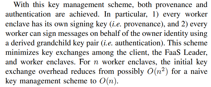 To derive a each set of public/private key pairs from a master key, we use Hierarchical Deterministic (HD) Wallet from Bitcoin Wallet[30]. HD Wallet is a key management scheme that allows all the child public keys to be derived from a single parent public key. We use hardened derived child keys, a scheme of HD wallet to prevent the problem of HD Wallet that the leakage of the child private key leaks the private key of the parent. HD Wallet enables efficient key management in PSL as follows: 1) After attestation between the client and the FaaS Leader, the client sends its owner key to the FaaS Leader. 2) The FaaS Leader generates a child public/private key pair for the current running application. 3) The FaaS Leader uses the application child key pair to generate multiple grandchild key pairs, one per worker enclave. 4) The FaaS Leader attests and sends every enclave its grandchild key pair. 5) FaaS Leader multicasts the application public key to all enclaves. 6) Each worker enclave derives the other worker enclaves’ public keys using the application public key.