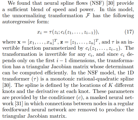 The model’s representational power increases with the number of parameters in the masked neural network and the number of knots in the rational-quadratic splines. We can also define more than one flow layer. For the composition of T layers