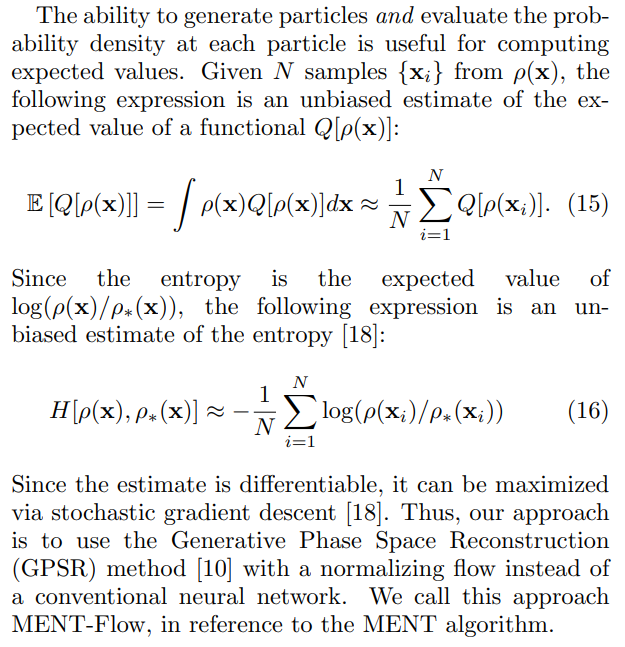 Compared to MENT, MENT-Flow increases the reconstruction model complexity and does not guarantee an exact entropy maximum. However, MENT-Flow scales straightforwardly to n-dimensional phase space and immediately generates independent and identically distributed samples from the reconstructed distribution function.