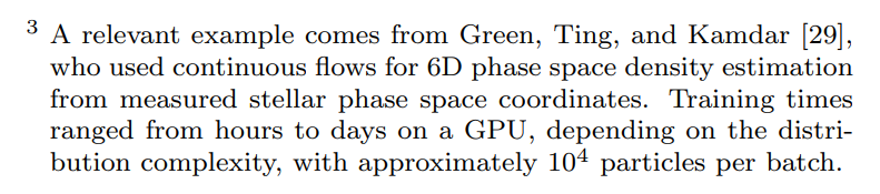 It is not immediately obvious whether normalizing flows can learn complex 6D distributions from projections in reasonable time. Flows preserve the topological features of the base distribution; for example, flows cannot perfectly represent disconnected modes if the base distribution has a single mode [28]. Thus, building complex flows requires layering transformations, either as a series of maps (discrete flows) or a system of differential equations (continuous flows), often leading to large models and expensive training.[3]