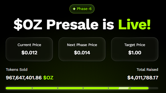 While Pepe’s forecast is undeniably strong, Ozak AI is quickly proving that utility-driven AI projects may offer even greater upside. Priced at just $0.0012 in its 6th OZ presale stage, Ozak AI has already raised over $4 million and sold more than 960 million tokens, signaling powerful early conviction from retail and whale investors alike.