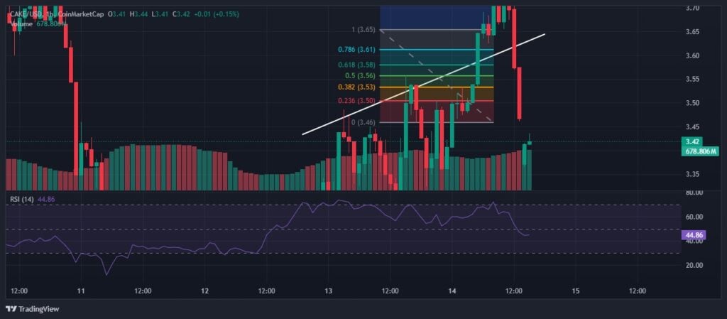 At the time of writing, $CAKE is trading at $3.46 with a market cap of around $1.18 billion. Despite repeated rejections at the $4.50 resistance level, the token continues to show resilience, with strong local support forming near $3.30.