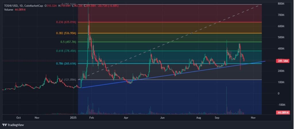 From a technical standpoint, Toshi’s market behavior suggests the potential for a renewed bullish trajectory once broader crypto sentiment stabilizes. After reaching a peak rally of over 440% in the past month, the token has since corrected but remains well above its early-year levels.